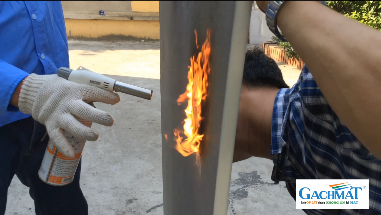 Ngoài các tính năng trên, gạch mát là gạch ốp lát đầu tiên sở hữu tính năng chống cháy cực hiệu quả. Gạch mát không bắt lửa, không dẫn cháy và có khả năng tự tắt lửa trong thời gian ngắn nhất sau khi được cách ly nguồn gây cháy (Cấp độ V0 theo UL94 VB – Cấp chống cháy cao nhất).