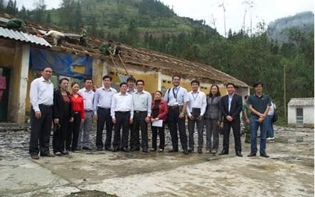 Cán bộ TONMAT cùng với lãnh đạo tỉnh xuống hiện trường khảo sát thông số kích thước mái trường học bị hư hại tại trường học để tài trợ tấm lợp
