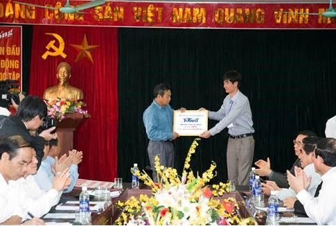 Ông Ngô Xuân Giang-GĐ nhà máy TONMAT miền Bắc trao quà ủng hộ là 1000m2 tấm lợp 03 lớp cách nhiệt, cách âm thương hiệu TONMAT