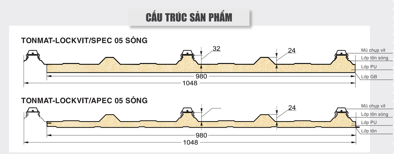 TONMAT-LOCKVIT/APEC là tấm lợp cũng có cấu tạo gồm 3 lớp, Lớp tôn mặt trên , lớp cách nhiệt PU ở giữa có 2 kích thước độ dày thông dụng là 20mm/50mm và lớp tôn mặt dưới. TONMAT-LOCKVIT/APEC phù hợp sử dụng cho những công trình trung tâm thương mại như: Vincom, Vinhomes, BigC, Đại học Anh Quốc Việt Nam…