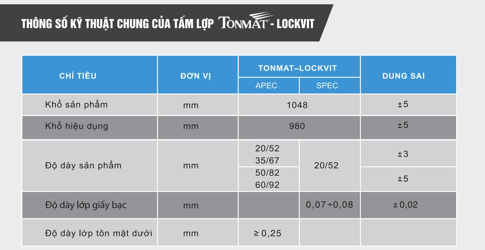 - Độ bền cao: TONMAT-LOCKVIT được làm từ tôn của Công ty Cổ phần Tôn Mạ Màu Fujiton, là đơn vị sản xuất tôn theo dây chuyền nhập khẩu đồng bộ từ Nhật Bản. Bề mặt tôn được sơn bằng hệ sơn Super Polyester (SPE/HDP) giúp tôn luôn sáng bóng, bền màu với thời gian và chống ăn mòn thủng lên tới 30 năm